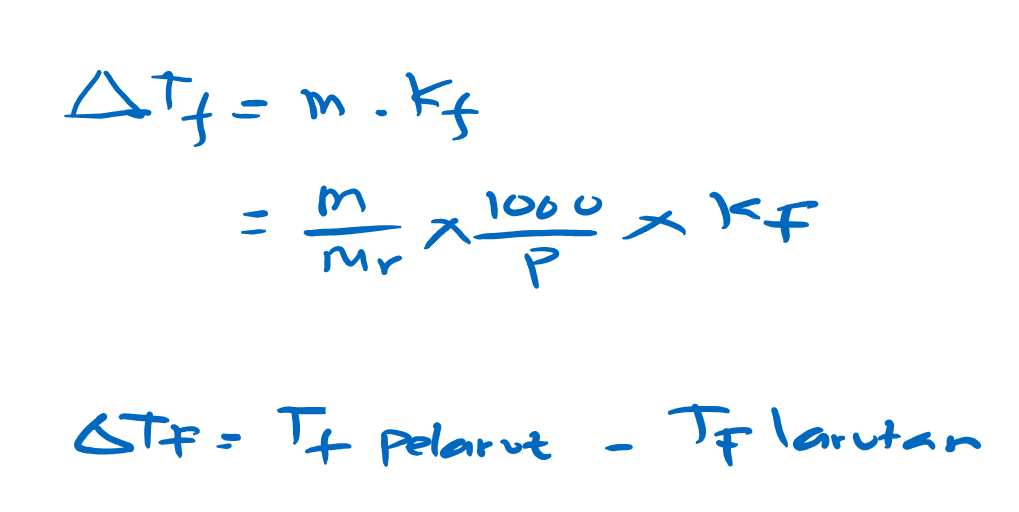 Penurunan titik beku larutan sebanding dengan kemolalan za terlarut dan dirumuskan dengan rumus sebagai berikut,